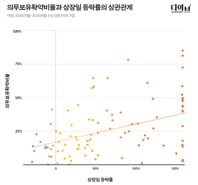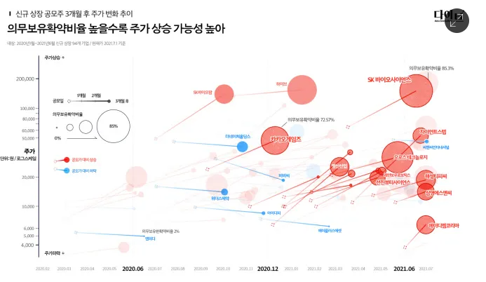 뿐만 아니라 의무보유 확약비율이 높은 공모주의 경우 상장당일에 시장에서 거래할 수 있는 물량이 적어지게 됨으로 더 높은 가격상승 역시 기대할 수 있다는 장점이 있습니다.