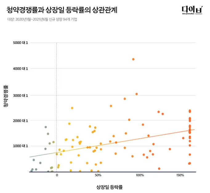 위 그래프에서 확인할 수 있듯이 청약경쟁률이 높을 수록 상장당일 주가가 상승했던 이력이 많네요.