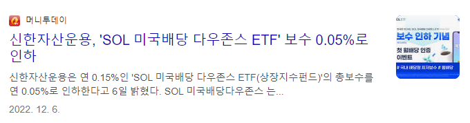 실제 기사를 찾아봐도 신한증권에서 기존 0.06%에서 총보수를 0.05%로 인하했다고 대대적으로 홍보하고 있음을 확인 할 수 있습니다.