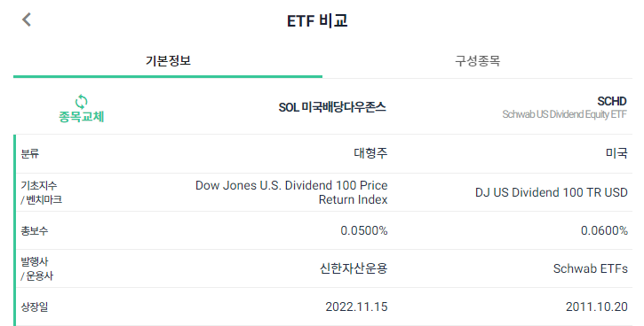 최근 미국의 SCHD ETF를 추종하는 SOL 미국배당다우존스 ETF를 예시로 한번 설명해보도록 할께요. 아래 검색결과에서 확인 할 수 있듯 SOL 미국배당다우존스 ETF의 총보수는 0.05%로 미국에 상장되어 있는 SCHD ETF보다도 낮습니다.