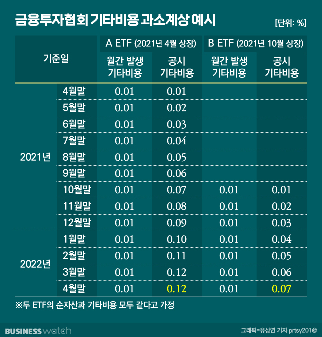 또 하나의 주의사항으로는 상장이 얼마 안된 ETF의 경우 기타비용이 증가할 여지가 있다는 사실입니다. 만약 매월 발생하는 기타비용이 0.01%라면 1년이면 0.12%겠죠?