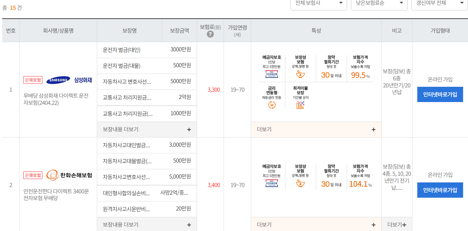 | 전체 보험료 | 3,300 | 3,400원 | 삼성화재 WIN |