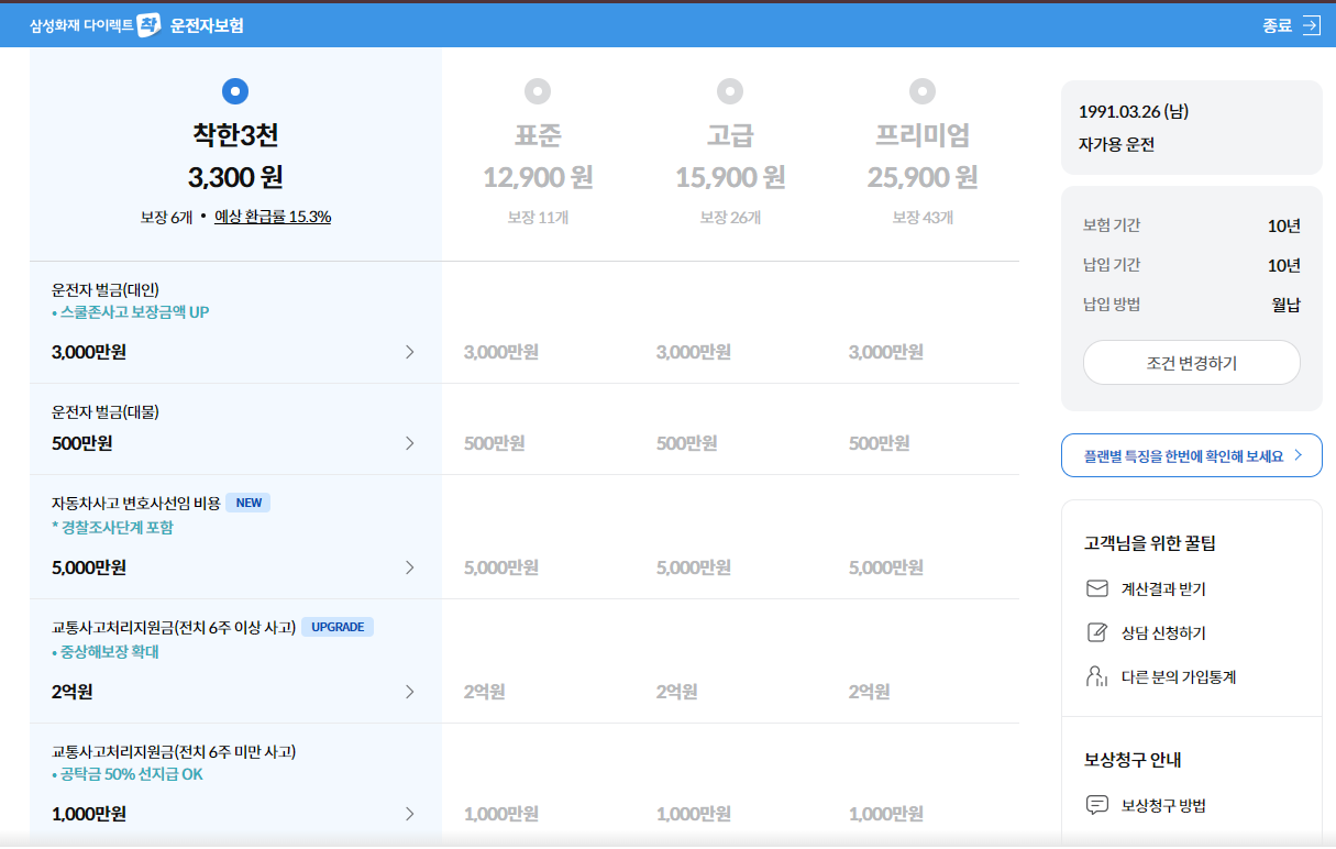 월 3,300원! 삼성 화재 다이렉트 운전자 보험 가입방법, 보장내역, 타 보험사 비교까지!