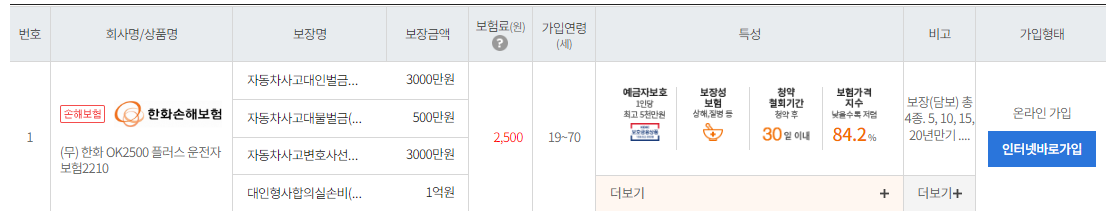 그렇기에 저는 월보험료가 가장 낮은 보험사의 상품부터 검토해보시는 걸 추천드립니다. 이 글을 작성하는 기준으로 [한화손해보험의 OK2500플러스운전자보험] 가 가장 낮은 월보험료인 2500원에 가입이 가능하네요.