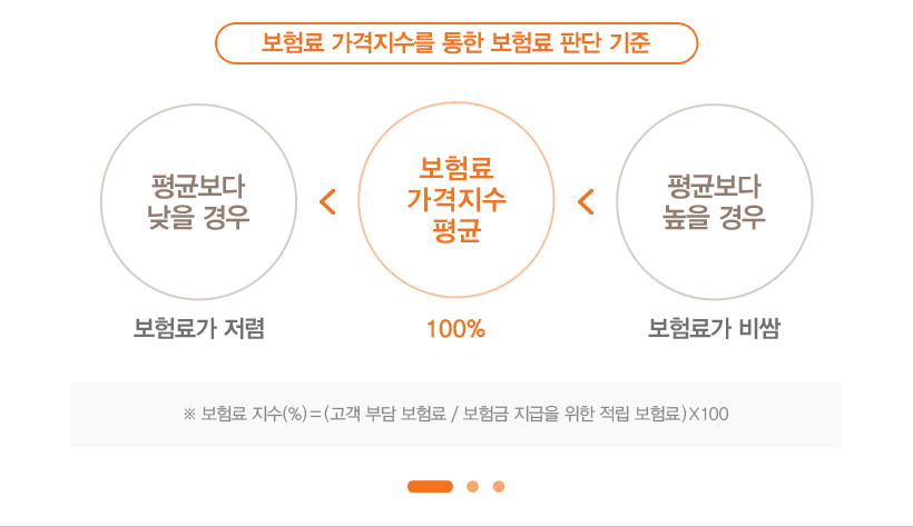 같은 보장일 때 어떤 보험이 저렴한지 직관적으로 비교할 수 있는 지표 중 하나가 보험가격지수입니다. 100%가 평균으로 평균보다 낮을 경우 상대적으로 사업비가 적고(=보험사의 이익이 적고) 가성비가 좋은 상품이라 할 수 있어요.
