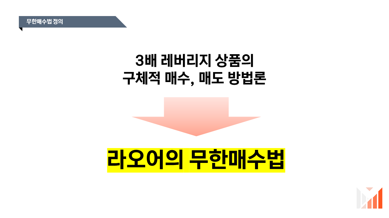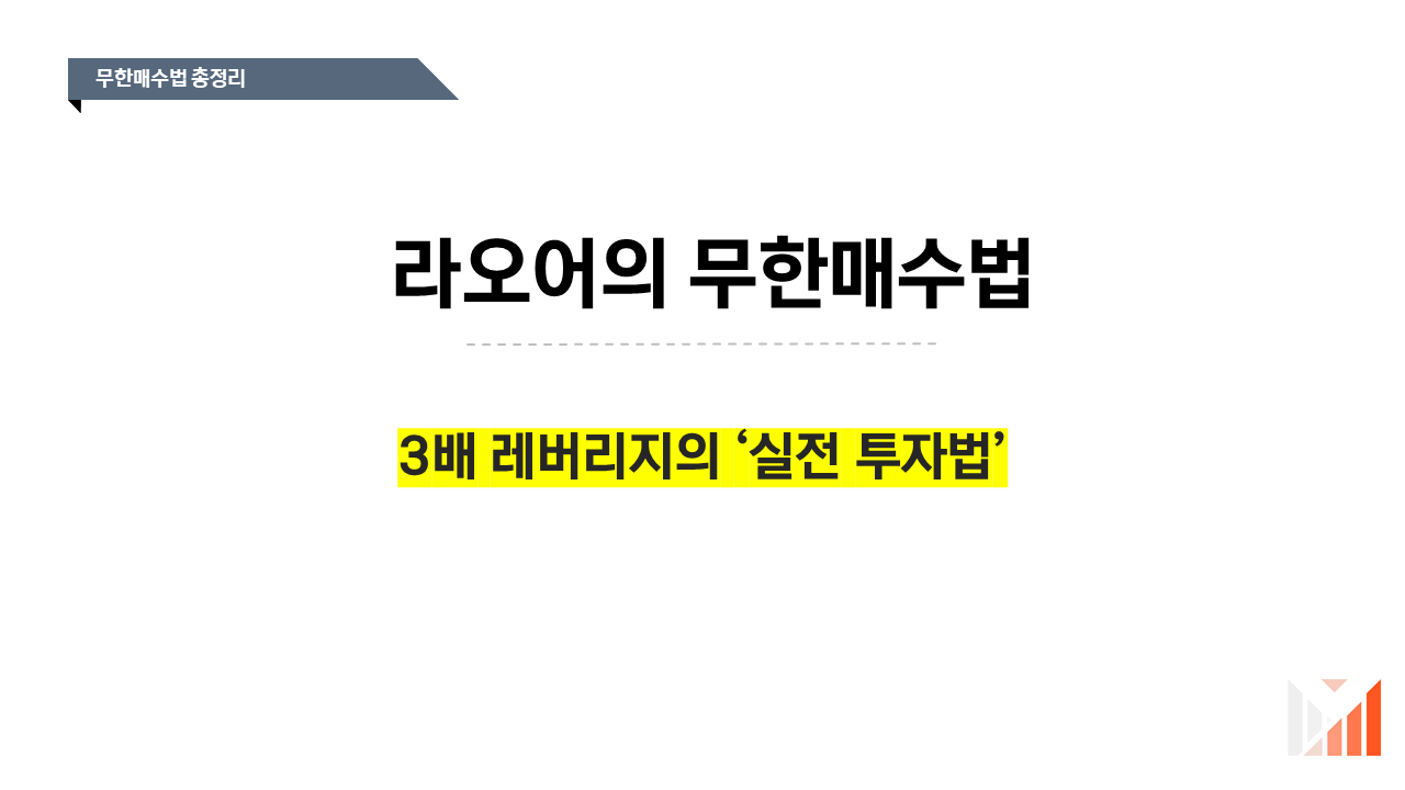 라오어님의 무한매수법은 3배 레버리지 ETF의 변동성을 활용하여 투자하는 방법론 중 하나입니다. 어떤 종목을 언제 어떻게 사고 몇 프로에 매도해야 하는지까지 정의되어 있는 실전에 바로 적용 가능한 투자법이죠.