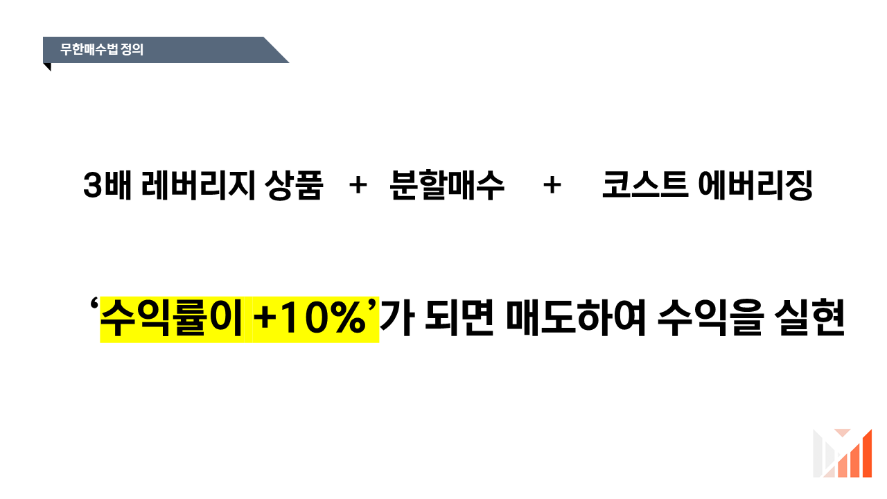 분할매수와 코스트 레버리징을 통해 평균단가를 낮춰주다 변동성에 의해 상승하는 시기에 매도하여 이익을 실현합니다. 즉 무한매수는 장기투자가 아닌 변동성을 이용한 단기투자 방법이죠.