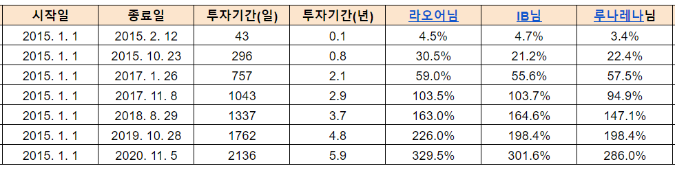 라오어님, IB연구소님, 루나레나님의 백테스트 결과를 비교해보니 약간의 차이는 있지만 기간별 수익률이 유사하게 계산되었다는 사실을 확인할 수 있었습니다. (루나레나 님의 스프레드 시트를 이용하여 30%는 세금, 70% 재투자를 진행하였어요)