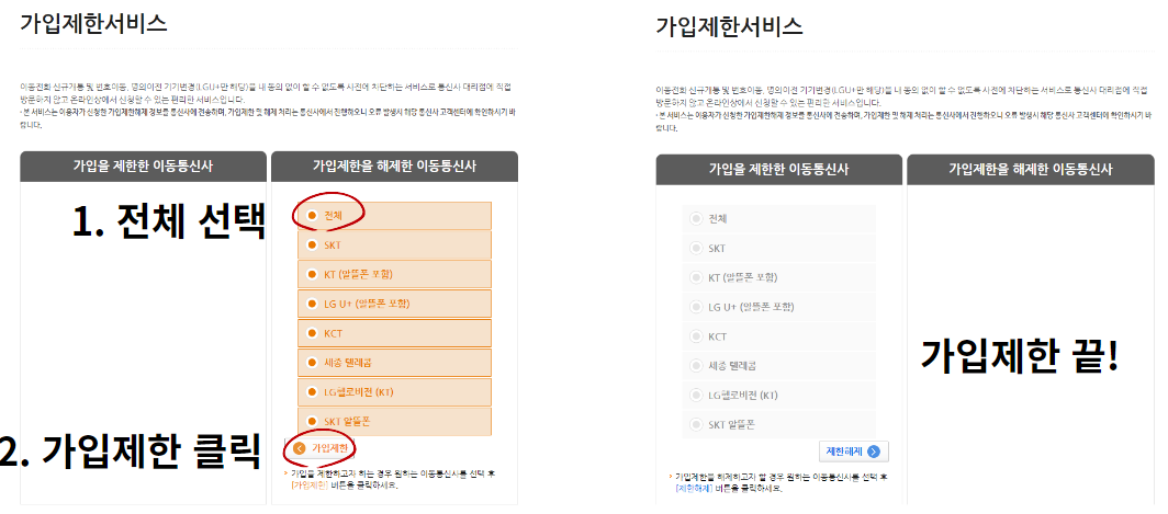 3. 온라인(비대면)으로 가입을 제한하고자 하는 통신사를 선택하면 끝!