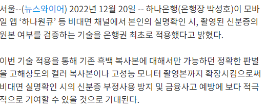 이는 대부분의 금융기관 심지어 우리가 안전하다고 생각하는 은행에서도 22년 12월에 최초로 신분증 사본검증 시스템이 최초로 도입되었다는 점입니다. 즉, 대부분의 금융기관에서 신분증의 컬러 복사본, 모니터 촬영본으로도 본인인증이 가능한 상황인거죠.