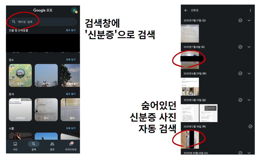 구글 포토를 예를 들어 설명하자면 검색창에 '신분증'으로만 검색해도 아래와 같이 자동적으로 이미지 검색이 가능하니 꼭 한번 확인해보시길 바랍니다.