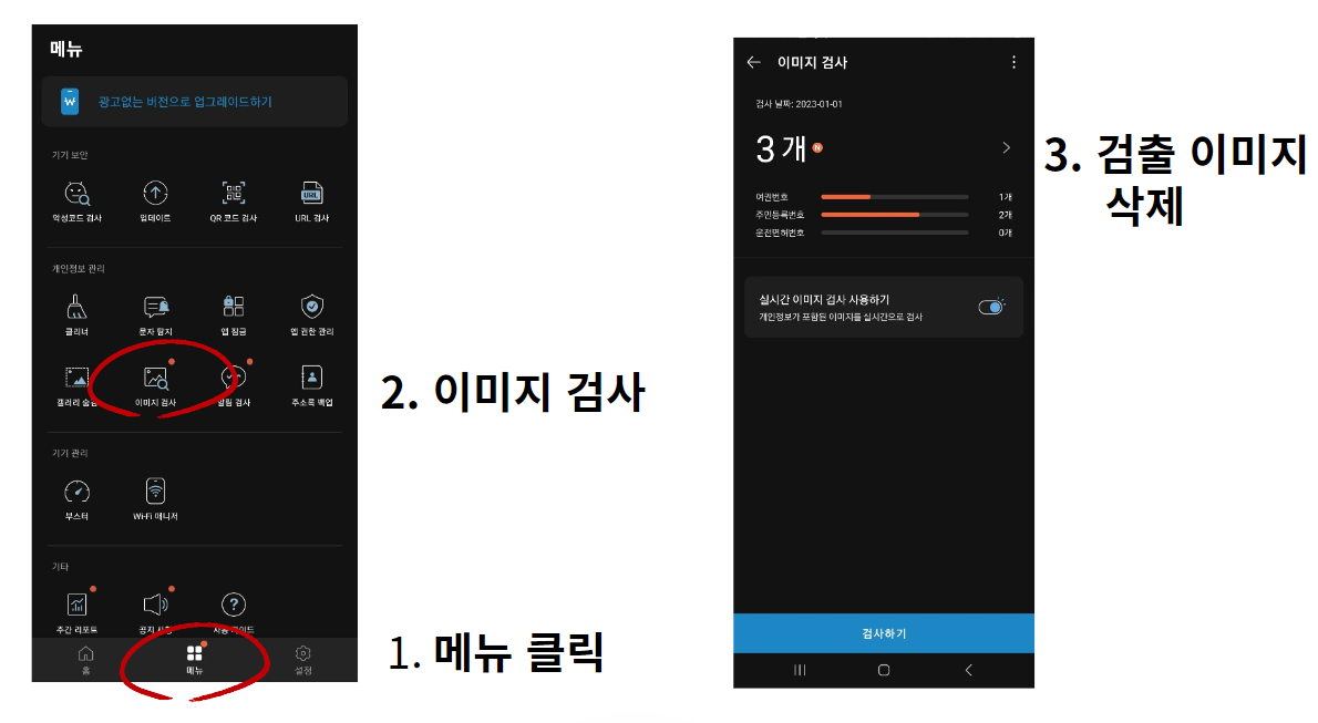 앱을 다운로드 하였으면 하단의 가운데 [메뉴] 버튼을 클릭 후 [이미지 검사]로 들어가 검사를 진행하면 여권번호, 주민등록증 등 개인정보가 포함된 이미지를 자동적으로 검사해줍니다.