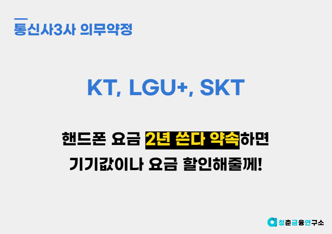 즉, 2년간 KT, LGU+, SKT는 기존고객이든 타 통신사에서 넘어온 번호이동 고객이든 2년간의 약정을 맺는 조건으로 핸드폰 구입비용을 할인해주거나 요금제를 25%할인해 주고 있습니다.
