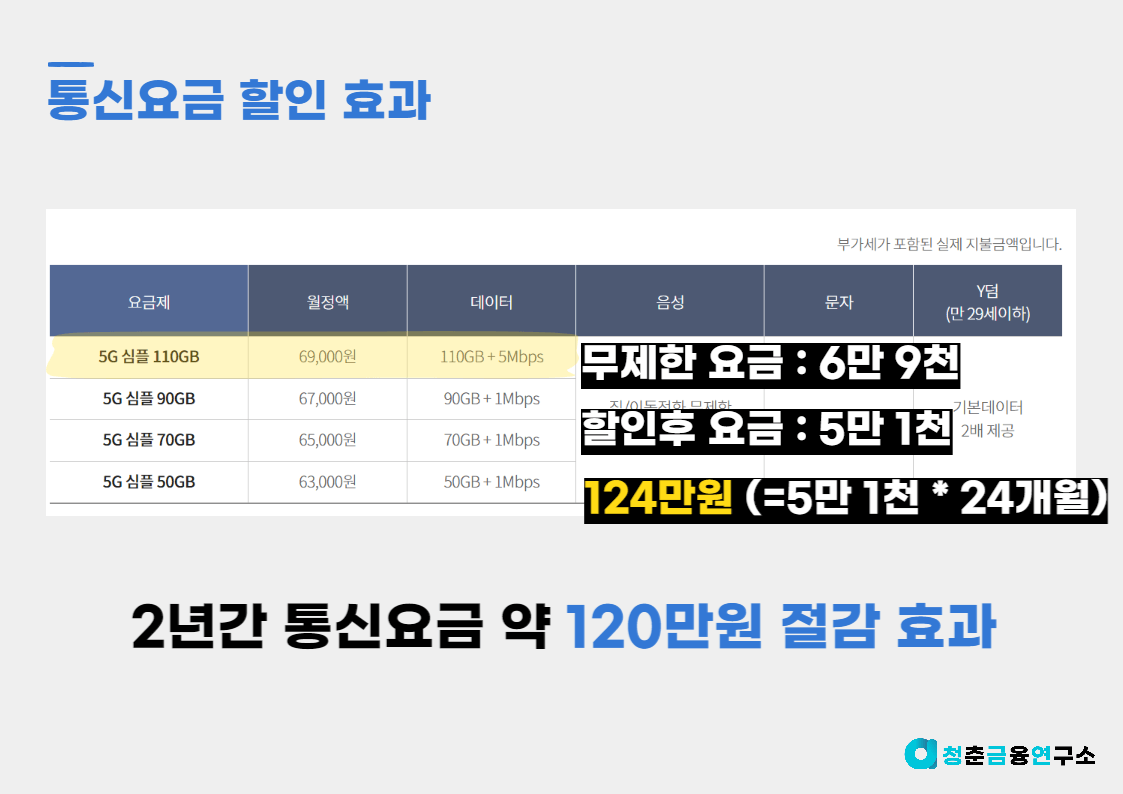하다 가정을 하고 통신 3사의 무제한 요금제인 5G 심플 110GB와 비교해봄으로써 그 절감효과를 계산해보록 할께요!