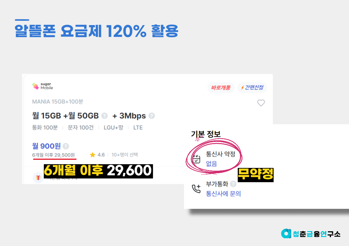 놀랍게도 알뜰폰의 의무약정기간은 대부분 없습니다. 즉, 언제든지 다른 통신사로 번호이동이 가능하다는 이야기이죠. 우리는 이러한 알뜰폰 업체의 장점을 120% 활용하려 합니다.