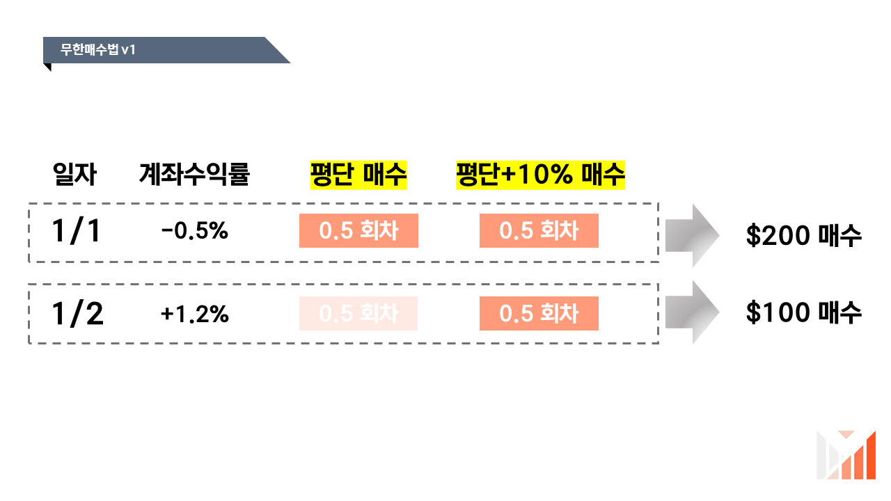 두번째 매수부터는 2가지 조건으로 나눠서 매수를 진행하게 됩니다. 하루 매수금액(1회차)의 반은 무조건 매수하고 나머지 절반은 현재가격이 평단보다 낮은 경우에만 매수하는거죠.