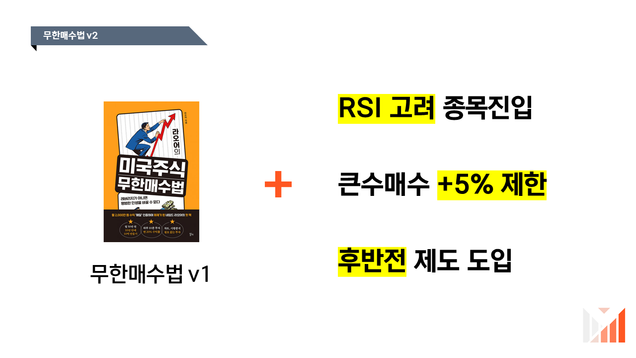 기본적으로는 무매v1과 동일하나 조금 더 보수적인 매수, 매도로직을 적용하고 있어요. 큰 개선사항을 정리하면 아래와 같습니다.