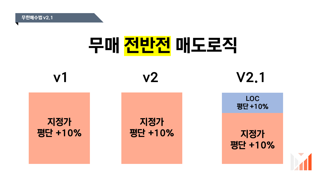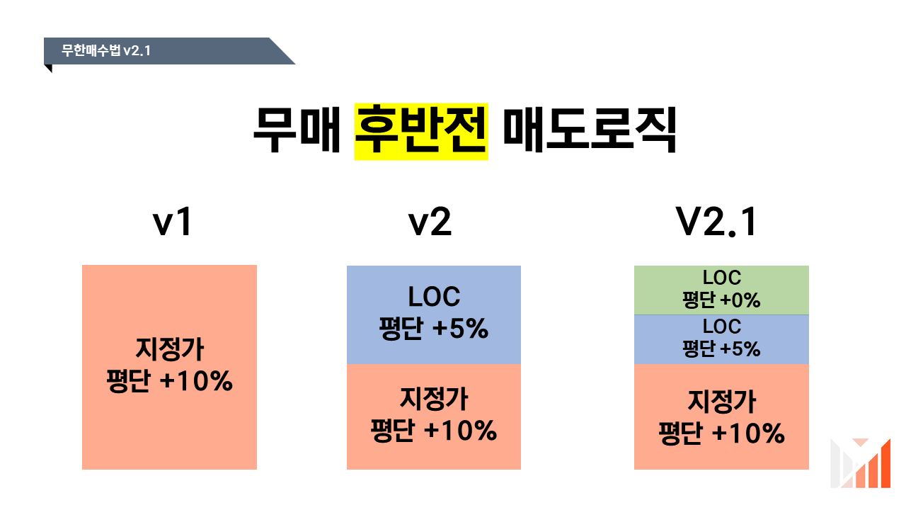 기본적으로 무매v2.1은 v2와 기본적인 구조는 동일합니다. 단 LOC매도를 신설하여 더 세분화를 진행하였다는 것이 개선점이죠.