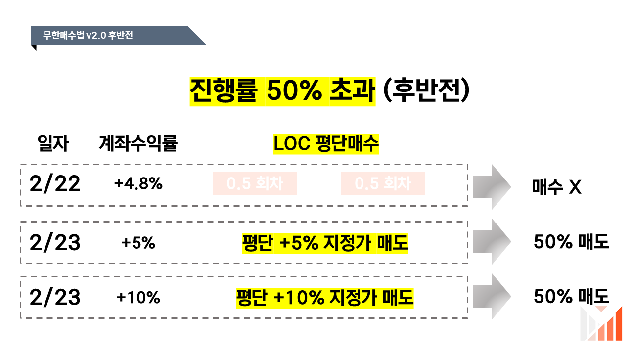 이처럼 부분매도가 진행되면 진행률을 기준으로 전반전과 후반전 로직을 각각 적용해주면 됩니다. 만약 40회차를 모두 소진한 경우에는 동일하게 영혼법을 실행하면 되구요.