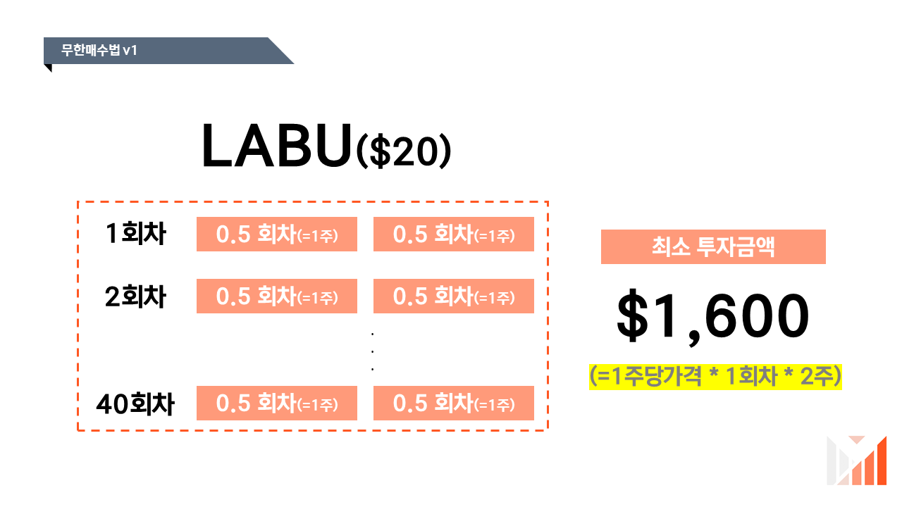 LABU를 40분할하여 진행하기 위해서는 최소 얼마의 원금이 필요할까요? 우리는 계좌의 상황에 따라 0.5회차(=0.5분할) 또는 1회차(=1분할)을 매수할껍니다.