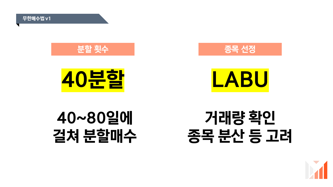가장 먼저 몇 분할로 매수를 진행할지 정해야합니다. 기본적인 무한매수법은 40분할로 진행이 되나 조금 더 보수적으로 운용하고 싶으신 분이라면 분할횟수를 늘리는 것도 가능해요.