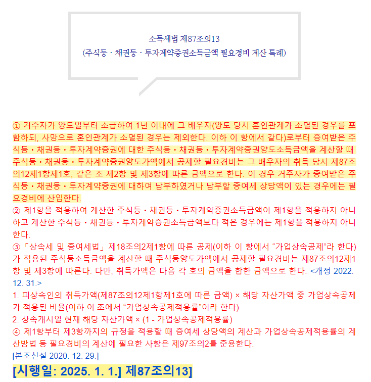 하지만 다행이도 23년 1월 1일에 시행 예정이였던 해당 규정이 25년 1월 1일로 2년 미뤄지면서 부동산과 다르게 주식의 경우에는 부부에게 증여 후 바로 증여가 가능합니다. 단, 25년이 되는 시점에는 아래에 나와있는 것처럼 해당 소득세법이 시행될 수 있으니 절세전략을 이용하기 전 꼭 확인이 필요합니다.