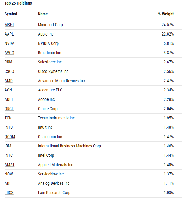 TECL의 구성종목을 살펴보기 위해서 같은 지수를 추종하는 XLK의 구성종목을 살펴보도록 하겠습니다.