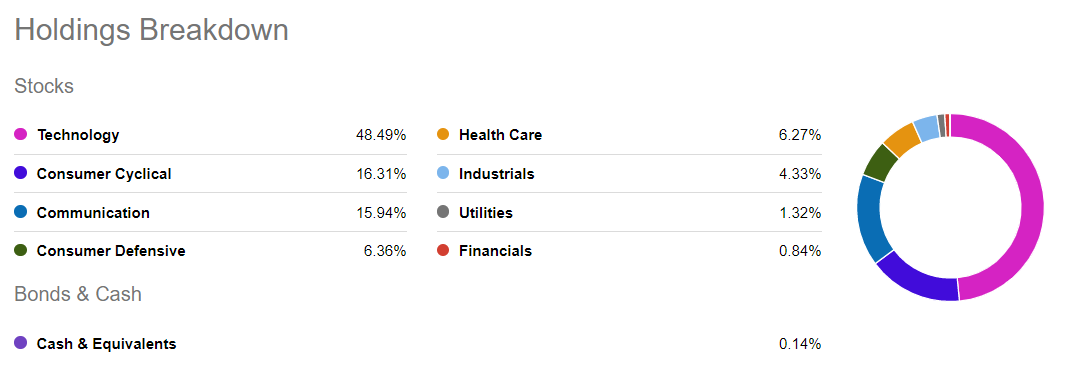 구성 종목 섹터를 보게되면 기술주(50%)로 가장 많고 그 뒤를 경기순환주(16%), 통신(16%) 순으로 구성되어 있네요. 여기서 통신(Communication)이 높은 비중을 보이는 이유는 알파벳, 메타와 같은 기업이 기술주가 아닌 통신섹터로 분류되었기 때문입니다.