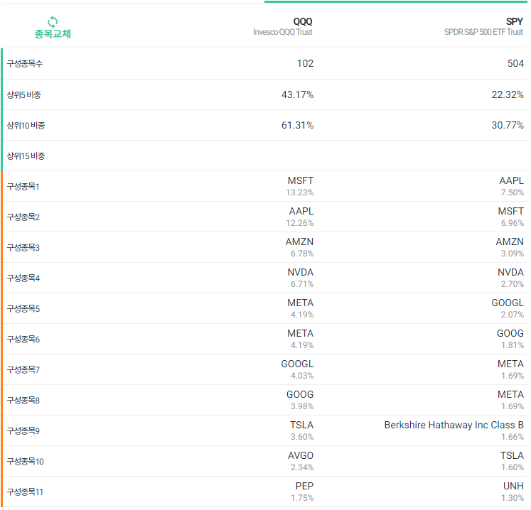 상위 10개 종목의 구성을 UPRO와 비교하여 살펴보게 되면 구성종목은 애플, 마소, 아마존 등 약간의 순서차이는 있지만 유사하다는 것을 확인할 수 있습니다.