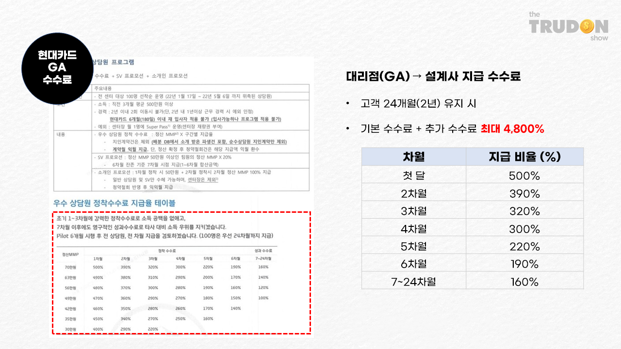 23년 1월 현대카드GA(보험대리점)에서 TM 상담원들에게 제시한 보험판매 프로모션 자료를 바탕으로 설명드리겠습니다. 해당 프로모션을 조금 상세히 살펴보면 직전 3개월 평균 소득이 500만원인 설계사(=능력 있는 설계사)를 대상으로 월납 보험료가 70만원 이상을 달성하는 경우 첫 달 500%의 성과 수수료를 포함 2년간 최대 4,800%의 수수료를 추가로 지급한다는 내용의 안내문인데요.