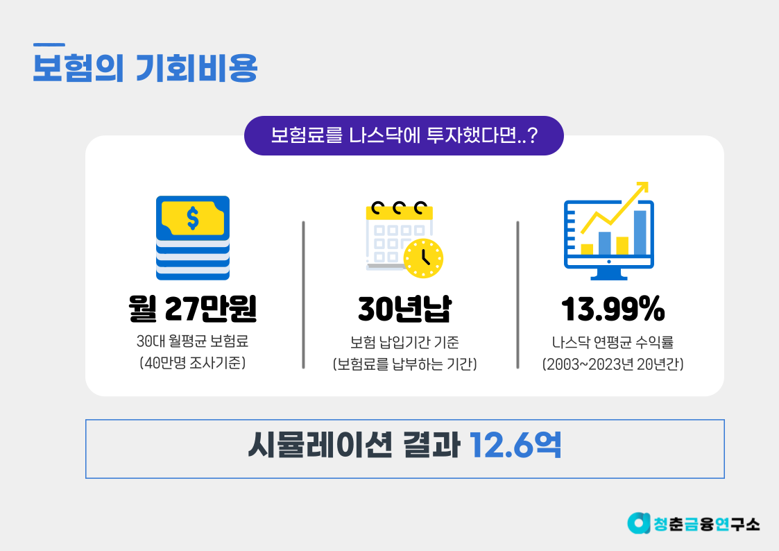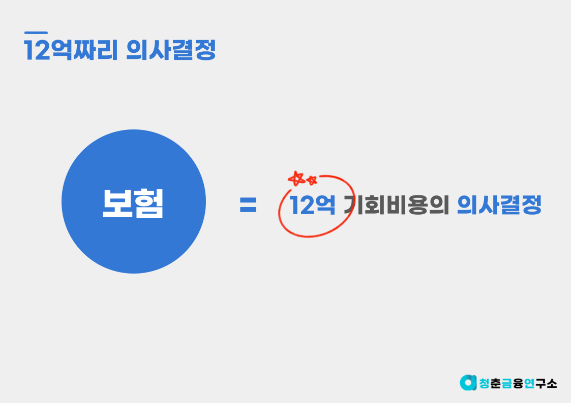 그래도 아마 대부분의 분들이 마음속으로는 '기회비용이 커봐야 얼마나 크겠어..'라고 생각하실 겁니다. 하지만 만약 매월 납부하는 보험료가 12억짜리 의사결정이었다면 생각이 달라질 것 같지 않나요?