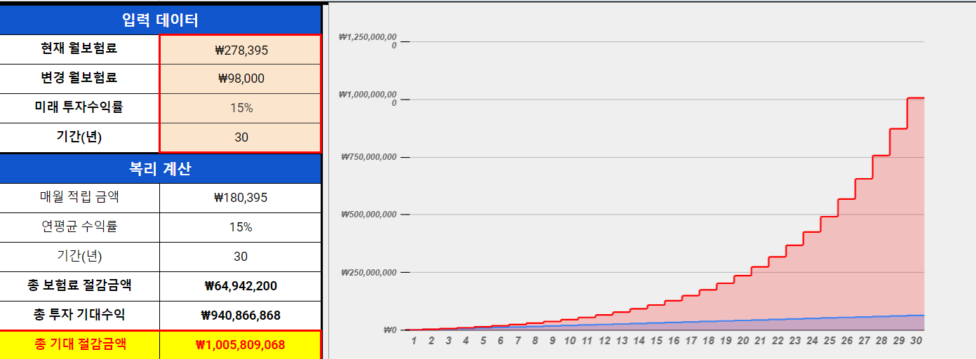 그럴 때마다 기회비용에 대한 시뮬레이션을 통해 미래에 절감이 가능한 금액을 산출하며 마음을 다잡았는데요. 여러분들도 직접 자신의 현재보험료 및 목표보험료를 기준으로 하여 계산해 볼 수 있도록 양식을 공유해드리고자 합니다.