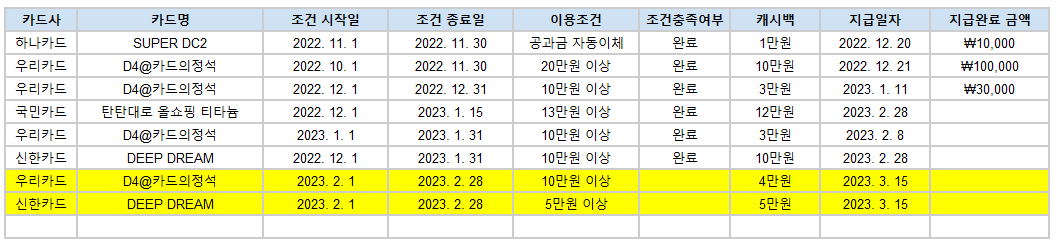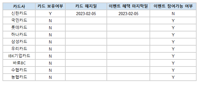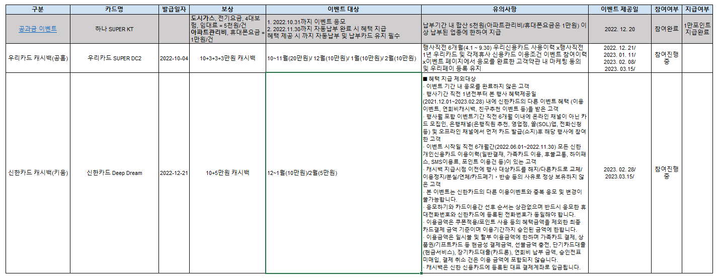 그렇기에 저는 이벤트 참여가능여부 카드를 구분하기 위해 이벤트 참여 후 마지막 캐시백을 받은 일자와 해당 카드를 해지한 날짜를 함께 기록해서 관리하고 있습니다.
