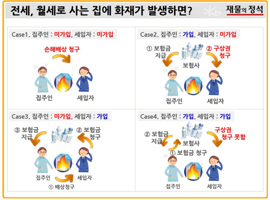 집주인이 화재보험에 가입이 되었다고 할지라도 세입자가 화재의 직접적인 원인 제공자라면 보험사에서 세입자인 '나'에게 배상을 청구하게 되기 때문에 화재보험 가입이 필요합니다.