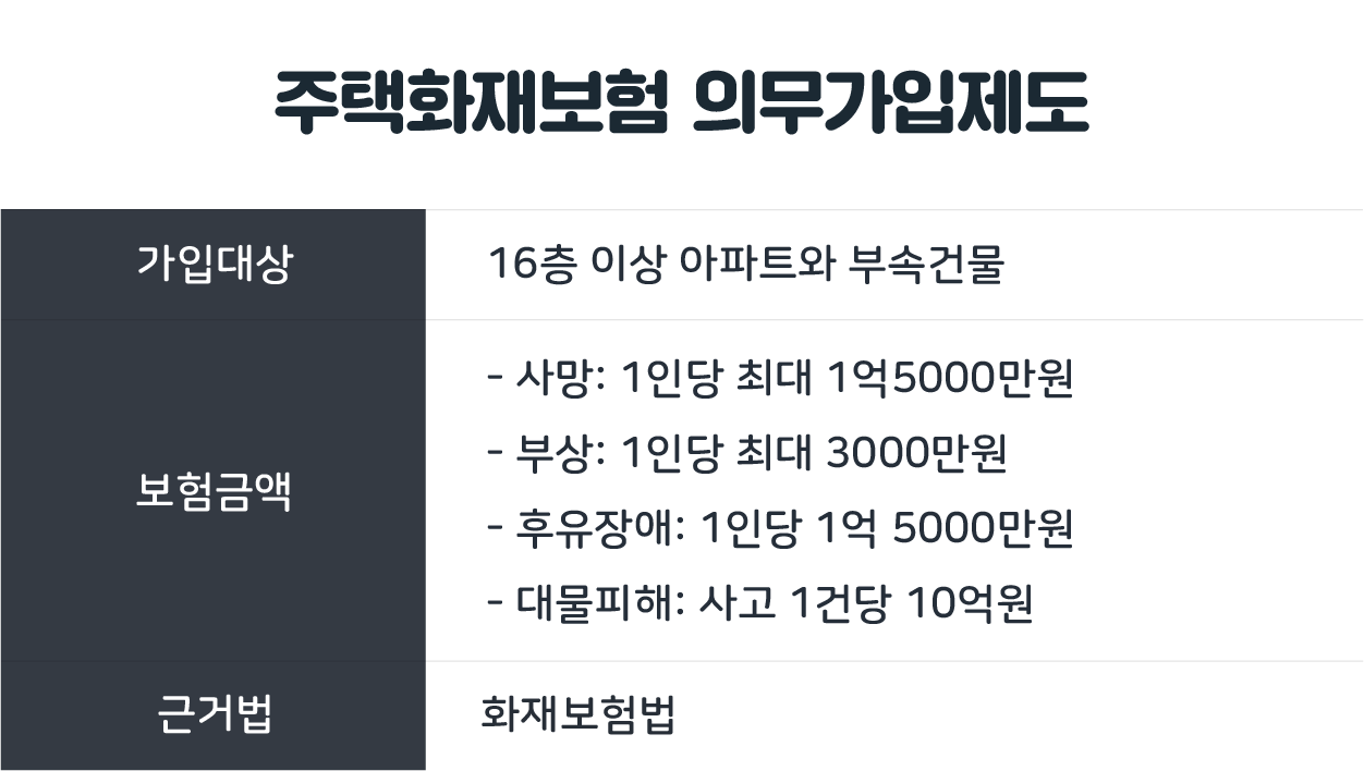 16층 이상 고층 아파트 거주자는 아파트 입주자 대표 명의로 단체화재보험에 의무 가입한니다. 15층 이하의 아파트도 요즘 대부분 화재보험이 가입되어 있죠.
