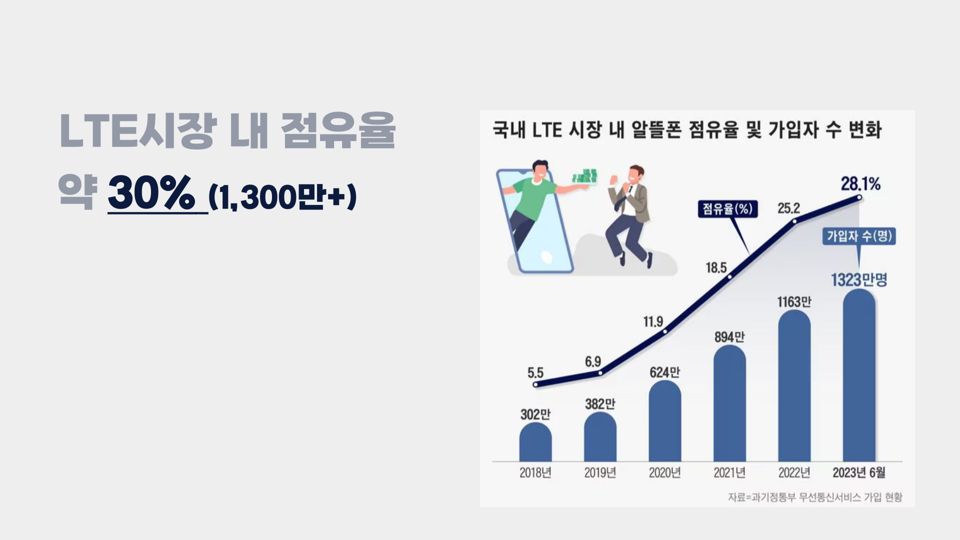 통신 3사의 경우 LTE 요금제의 가격을 올려 5G 요금제를 강제로 선택할 수밖에 없도록 유도하고 있지만 알뜰폰에서는 LTE(4G)와 5G를 자유롭게 선택이 가능한데요. 이러한 이유로 23년 기준 LTE 시장에서 30%에 가까운 고객인 1,300만 명 이상이 알뜰폰 요금제를 이용하고 있고 실제로 그 추세가 가파르게 증가하고 있습니다.