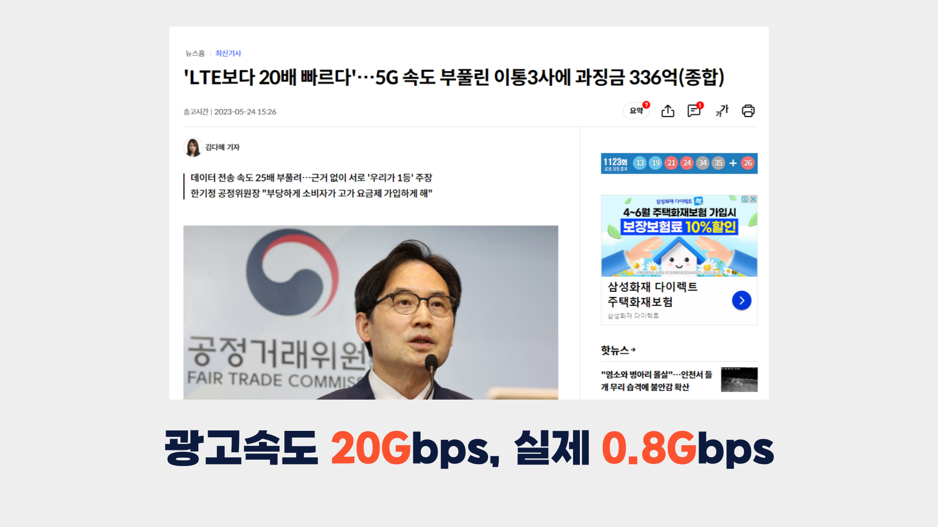 제가 앞서 '실제로 제공되는'이라는 단어를 붙인 이유는 많은 분들이 아시겠지만 통신사에서 이용하는 속도와 실제로 제공된 느 속도에는 꽤 큰 차이가 있기 때문인데요. 기사에서 보듯 통신사에서는 이론적인 속도로 홍보를 하지만 실제 현실에서 제공되는 속도는 이에 한참 미치지 못하는 속도가 제공되기 때문이죠.
