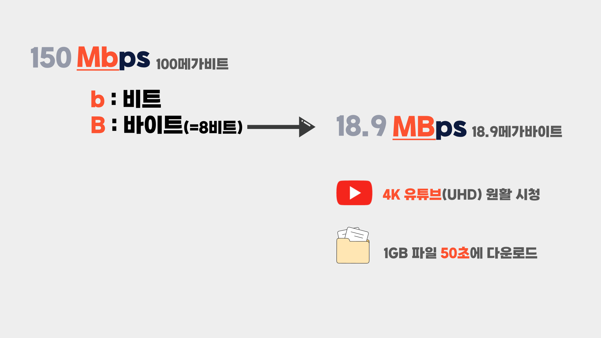 이를 위해서는 비트(b)와 바이트(B) 대소문자의 차이를 구분할 수 있어야 하는데요. 대문자인 1바이트를 8개의 소문자 비트로 구성된 단위입니다. 즉 앞서 설명한 150메가비트(Mb)는 우리가 친숙하게 아는 메가바이트(MB)로 환산하면 18.9메가바이트가 되는 거죠. 즉, 1초에 18.9메가바이트를 다운로드할 수 있는 속도라는 의미입니다.