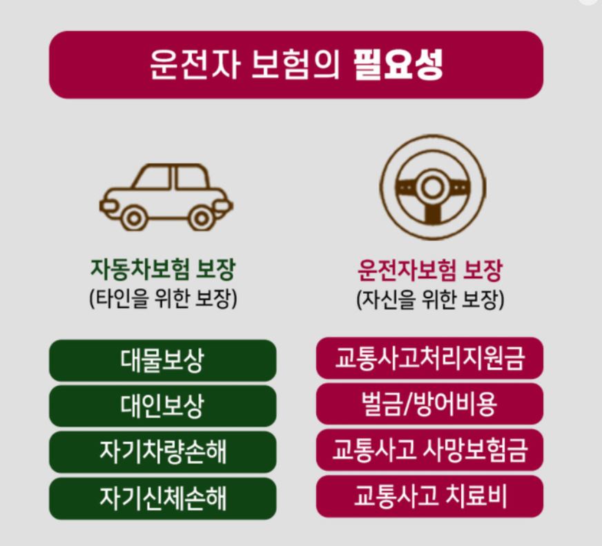 운전을 하다 사고가 발생하는 경우 상대방, 자동차에 대한 손해는 자동차보험으로 보상이 가능하지만 사고로 인해 법적, 금전적 책임에 대해서는 보상을 받을 수가 없는데요. 이때 필요한 것이 운전자 보험입니다. 운전자보험은 교통사고 처리지원금(합의금), 벌금, 변호사선임비 등을 보장해주고 있기 때문이죠.