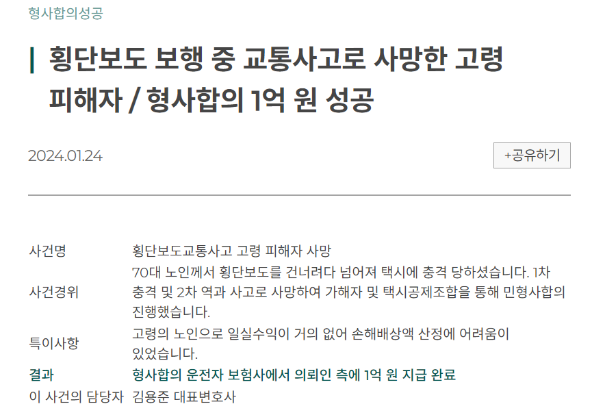 형사합의금 1억 원 합의('24.1월 사망사고 사례)