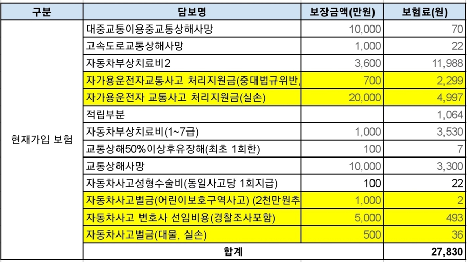 이러한 영업방식은 실비에서만 나타나는 것은 아닙니다. 실제 제가 리모델링을 도와드린 지인분의 운전자보험 사례만 보더라도 핵심 담보로만 구성하면 2~3천 원 대면 충분함에도 지인 설계사를 통해 가입한 운전자보험의 월 보험료는 3만 원(약 10배)에 가까웠습니다.