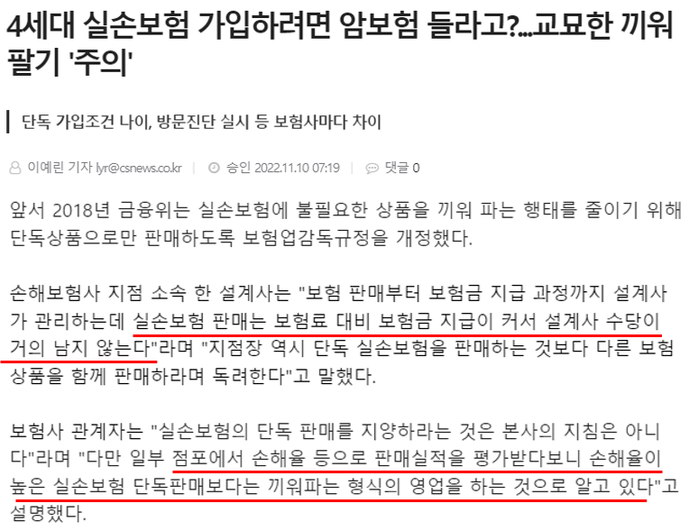 소제목이 너무 자극적이라고요? 신문기사에 나와있는 손해보험사 지점 소속 한 설계사의 인터뷰 내용을 보시면 생각이 달라지실 겁니다.