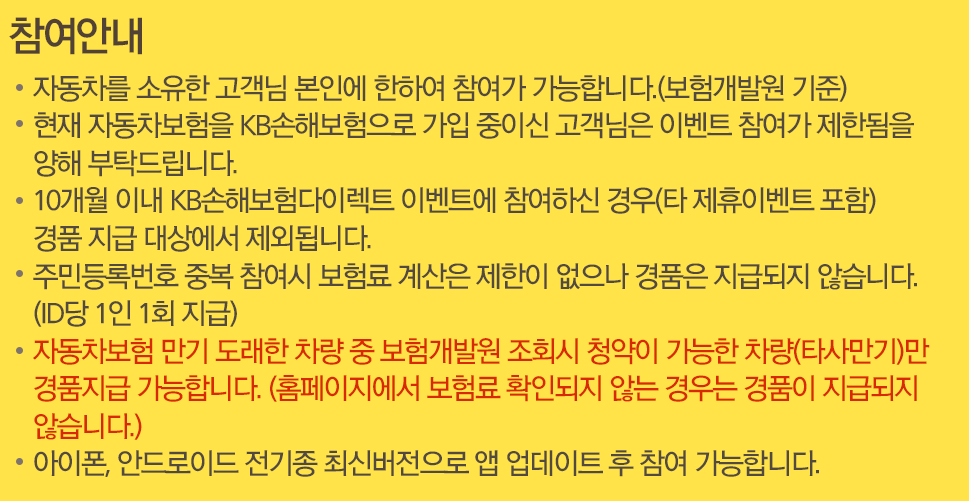 하지만 아쉽게도 자신이 현재 가입 중인 보험사의 이벤트의 경우 참여가 불가한데요. 만약 제가 KB화재의 자동차보험이 올해 3월에 만기가 된다 하더라도 이벤트 참여는 불가능한 거죠.