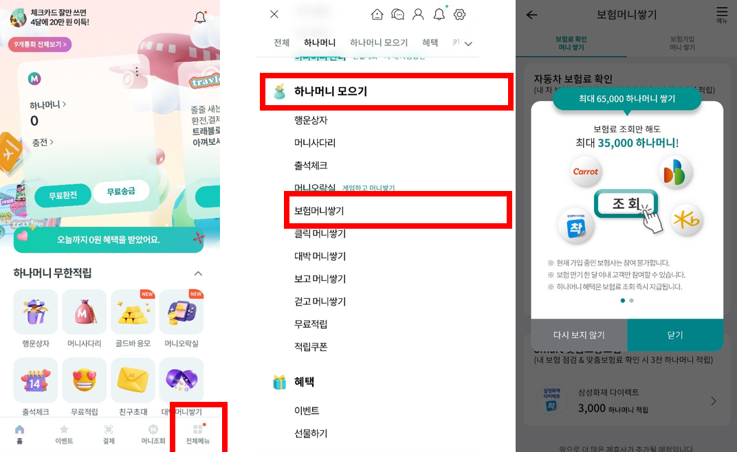 우선 하나머니 앱을 다운받으시고 메인 앱에서 [전체메뉴]를 클릭합니다. 이후 [하나머니 모으기 - 보험너니쌓기]를 눌러주시면 현재 진행 중인 자동차보험 조회 이벤트 조회가 가능해요!