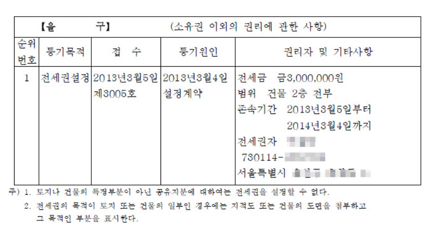 전세권 설정이란 전세, 월세 계약에 대해 단순히 계약서 작성으로 끝나는 것이 아닌 등기사항전부증명서(등기부등본)에 '전세, 월세 계약을 표시'하는 것을 의미하는데요. 여러분들이 전세권 설정 등기를 진행하게 되면 해당 물건에 아래와 같이 표시됩니다.