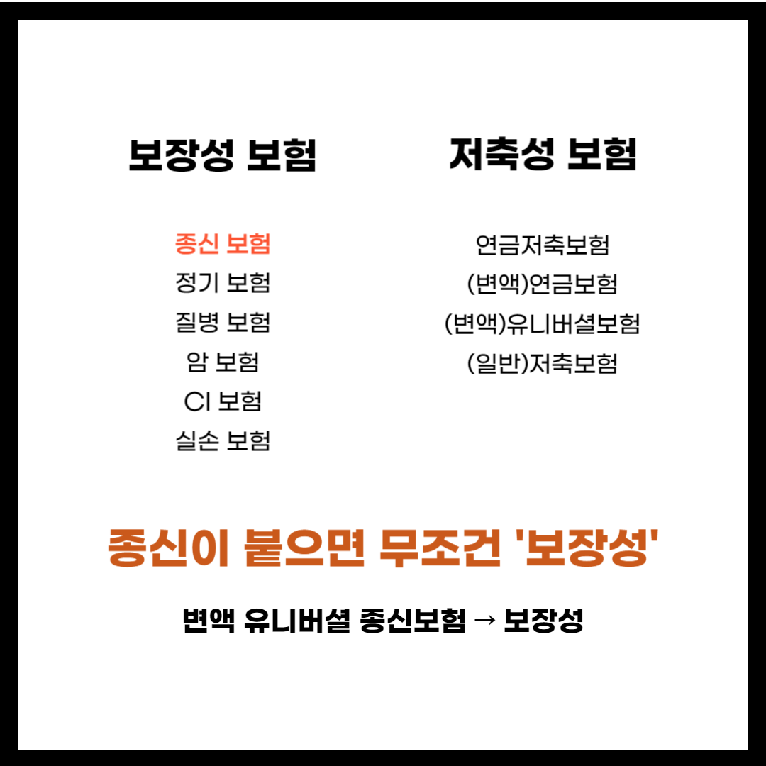 하지만 여기에 변액 종신보험, 변액 유니버셜 보험과 같이 보장성 상품에 저축성 보험을 섞어 놓은 보험의 경우 저축성일까요? 보장성일가요? 구분 기준은 보험명에 '종신'이라는 단어가 들어가면 무조건 보장성 보험으로 이해해 주시면 됩니다. 예를 들어 설명하면 아래와 같죠.