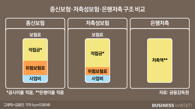 그럼 왜 우리가 보장성, 저축성 보험을 구분할 수 있어야 할까요? 보장성 보험은 사망, 질병 발생 시 보장을 해주는데 그 목적이 있다 하면 저축성 보험은 보장보다는 '투자/저축'에 포커스가 맞춰져 있기 때문이죠. 그렇기에 상대적으로 위험보험료의 비중이 높고 사업비 역시 통상 연금보험의 비해 2~3배 높은 경우가 많기에 아래 표처럼 저축보험료의 비중은 압도적으로 적어질 수밖에 없죠.