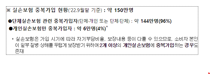 실비의 경우 '실제로 발생한 비용'에 대해 보상을 해주는 구조이기에 대부분의 경우 2개를 중복해 가입해도 큰 효과가 없습니다. 하지만 22년 9월 기준 실손보험 중복가입자가 무려 150만명이라고 합니다.