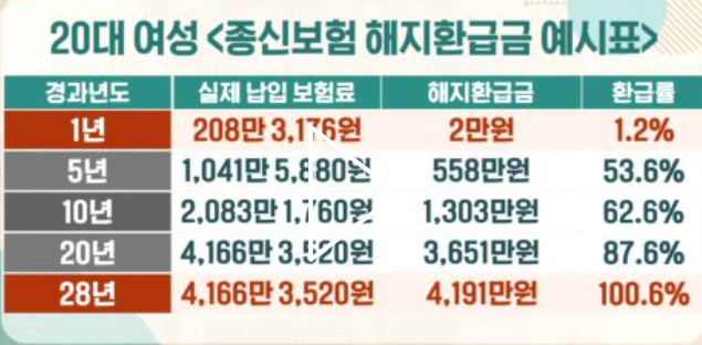 여기에 중도해지를 통해 원금회수(환급률 100%)가 가능한 시점은 28년 후로 은퇴가 가까운 시기까지 월 20만원에 가까운 보험료를 납입해야 손해를 보지 않을 수 있습니다. 사실 원금을 찾더라도 인플레이션을 고려하면 엄청난 손해이긴 하지만요. 생각해보면 30년전 5천만원과 현재의 5천만원이 같을까요?