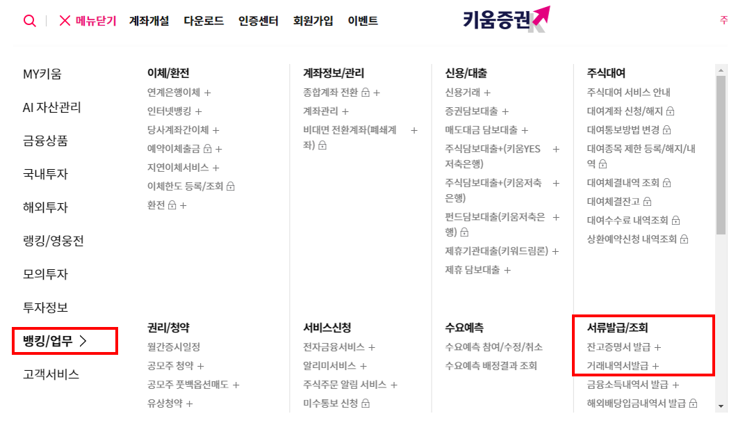 증여를 받는 수증자의 계좌는 키움증권에 있기에 키움증권에서 서류를 발급받는 방법을 살펴보면 아래와 같은데요.